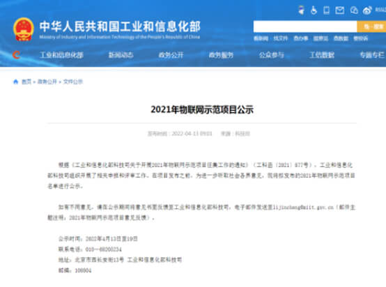 4月13日,國(guó)家工業(yè)和信息化部公示了“2021年物聯(lián)網(wǎng)示范項(xiàng)目”入選名單。該示范項(xiàng)目由工業(yè)和信息化部組織開(kāi)展,旨在聚焦物聯(lián)網(wǎng)關(guān)鍵核心技術(shù)創(chuàng)新突破,解決行業(yè)迫切需求,推廣價(jià)值高,帶動(dòng)作用強(qiáng),可作為典型案例在物聯(lián)網(wǎng)行業(yè)。